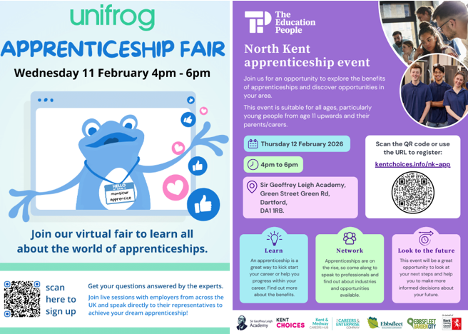 Unifrog Virtual Apprenticeships Fair. This event is free for all students and ideal for Years 10 to13. Students can connect with a huge range of employers and are welcome to drop in for just one or two sessions or stay for the full fair. Expert advice will be available on how to find the right apprenticeship and apply successfully in live sessions with top employers including the BBC, Aldi, and Unilever. Click here to sign up Apprenticeship Fair. The North Kent Apprenticeship Event is being held at nearby Sir Geoffrey Leigh Academy this year, details in the below poster – all students are welcome to attend!