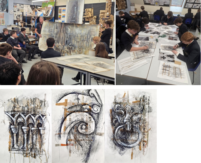 Art students in Year 10, 11 & 12 were fortunate enough to take part in a one-day workshop with professional artist Ian Murphy. Ian travels all over the world, drawing architecture and environments in his sketchbook, then returns to his studio and produces huge atmospheric oil paintings inspired by his travels. He brought a lot of his work to show the students, which provided some inspiration before they started their practical work. He taught students about the creative process and risk-taking and introduced them to some of the mixed media techniques he uses in his own work. It was a busy and very productive day resulting in some really exciting outcomes from the students.